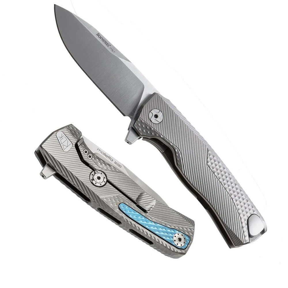 LionSteel ROK - סכין מתקפלת M390 להב סאטן, ידית טיטניום אפורה כחולה ROK G