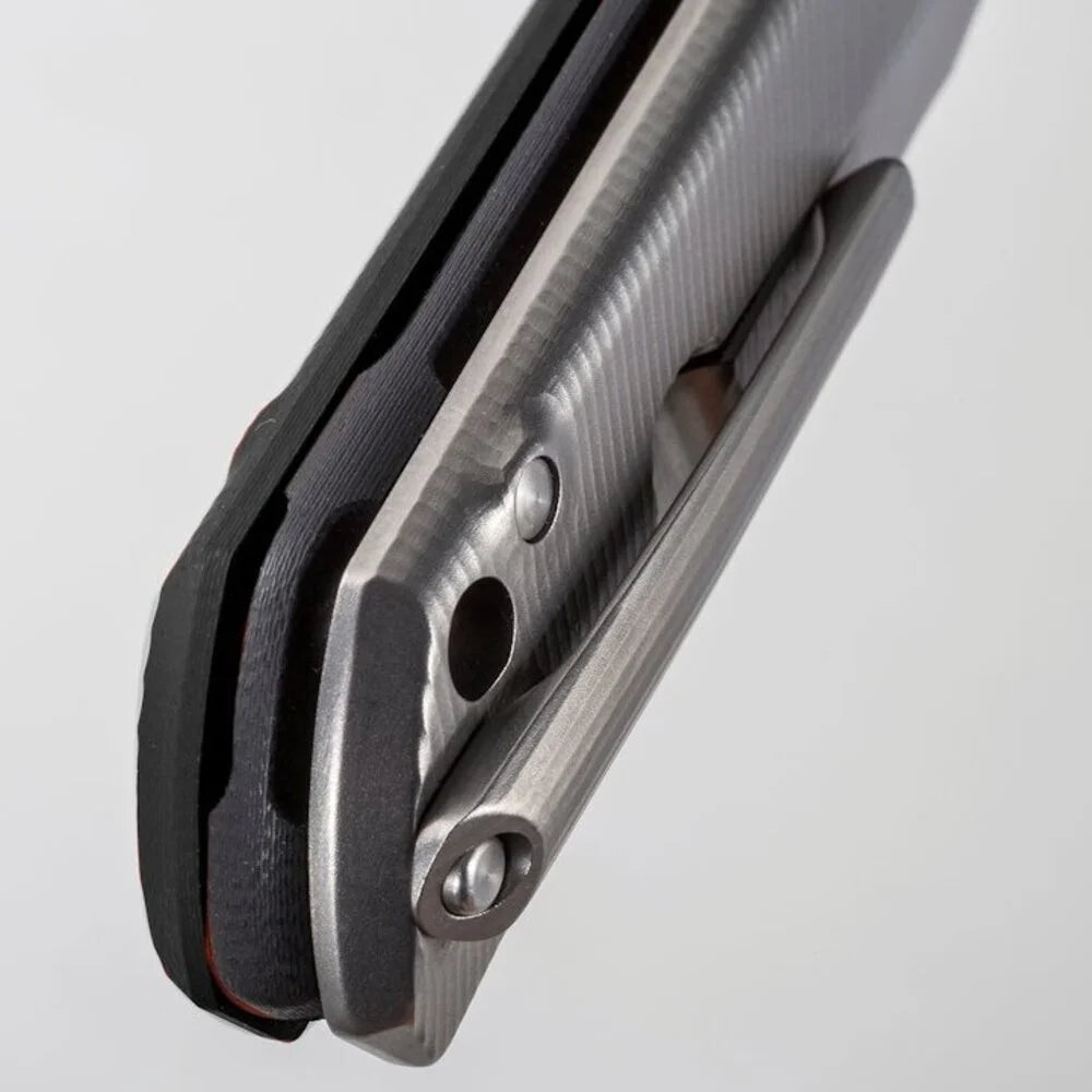 הסכין כוללת מערכת נעילת מסגרת חזקה המשולבת במסגרת טיטניום אפורה, המבטיחה אחיזה בטוחה של הלהב ללא ויתור על משקל או אלגנטיות. משלימה את מבנה הטיטניום היא קנה יד Black G10, המציע אחיזה מצוינת, עמידות בפני פגיעות ומראה קשוח.