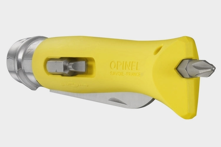 הסכין המתקפל מס' 09 של OPINEL עשה זאת בעצמך הוא הכלי המושלם לשימוש בבית, במכונית שלך או בכל מקום שצריך לחתוך, להבריג וכו'. ידית הפולימר מחוזקת כדי לעמוד בטמפרטורות קיצוניות וחשיפה ממושכת למים. להב ה-Drop Point חזק ועמיד לעבודות קשות. הסכין כולל שני חריצים לחיתוך חוטי ברזל וחמשל. הידית יכולה להחזיק ביטים סטנדרטיים בגודל 1" ובקצה של הידית יש חור מגנטי המאפשר לך להשתמש בסכין כמברג למשימות קלות. הקפד לסגור את להב הסכין ולנעול אותו עם נעילת Virobloc לפני השימוש בראש השטוח והפיליפס.